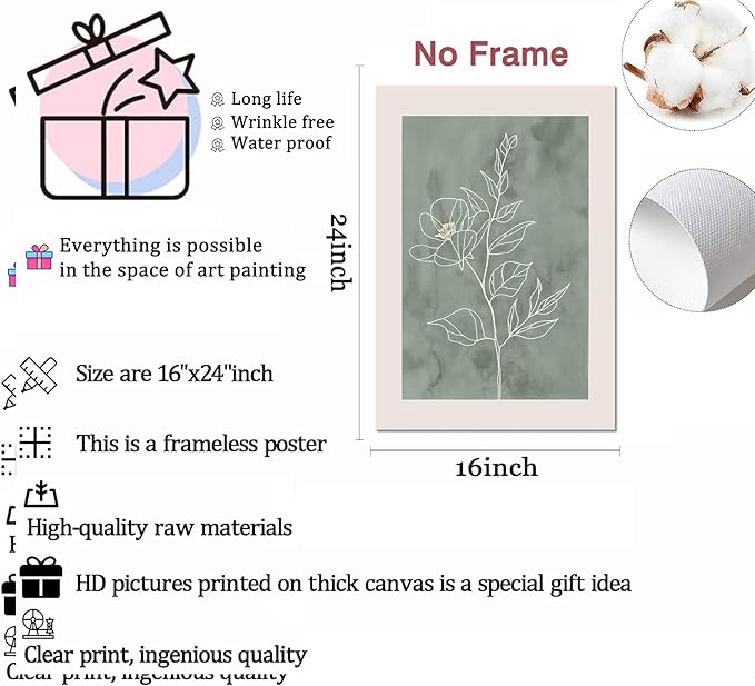 - Sage Green Line Wall Art Size :16x24in(40x60cm),set of 3, only contains canvas poster, unframed.Elevate your space with our exquisite abstract line floral wall art, adding a touch of nature-inspired charm to any living room, bedroom, bathroom and creating the perfect botanical decor.