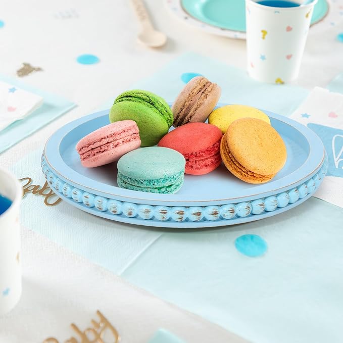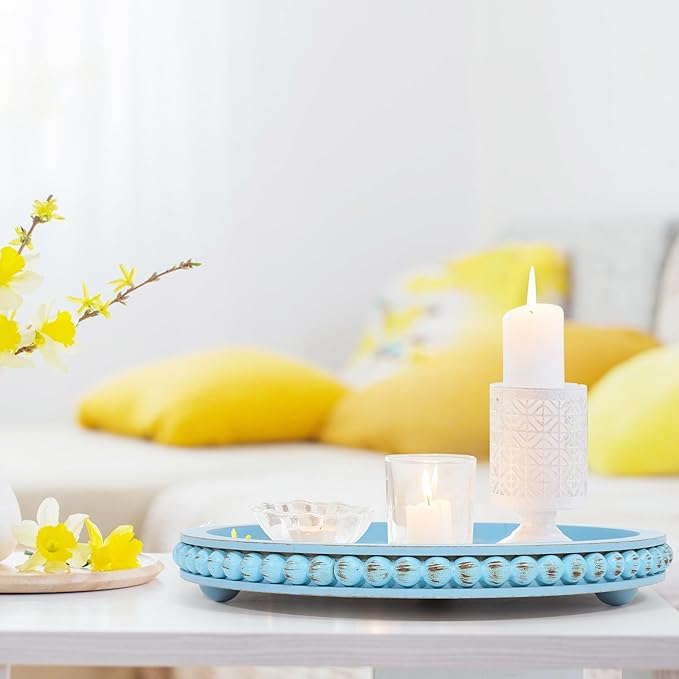 HPC Decor 12in Round Blue Wood Beaded Tray - Decorative Living Room, Coffee Table, Kitchen Table, Dining Room or Farmhouse Serving Tray