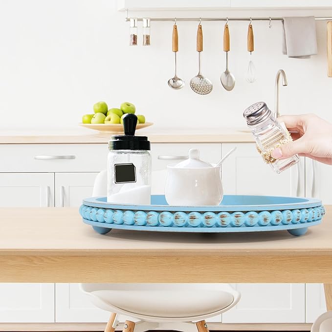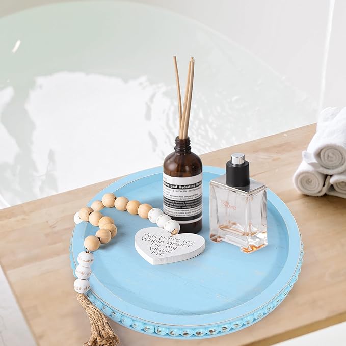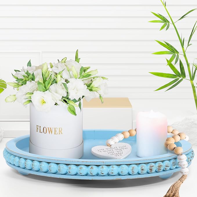- 【Gorgeous Beaded Tray】:The round beaded tray features special distressed bead accents.Match these items as living room decor, coffee table decor or farmhouse kitchen decor. The decorative tray itself is surely an eye catching and a conversation piece as it comes with unique bead accents around tray.Place it as a centerpiece on your kitchen counter, dining table, entry way table and MORE!