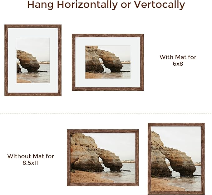 Picture Frame 8.5x11, Natural Oak Wood 8.5 x 11 Photo Frame, 8.5 by 11 Frame for Wall, 8.5x11 Picture Frame with Mat for 6x8, Tempered Real Glass, Walnut Color, Set of 1