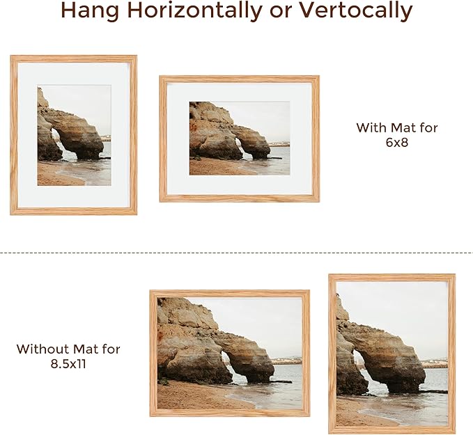 - NATURAL SOLID OAK WOOD FRAME - This 8.5x11 picture frame is made of high-quality 100% solid oak wood, the natural wood grains on this real oak wood picture frame lends it an authentic look. This poster frame comes with 1.2mm ivory mat for visualizati on purposes, and 8.5 x 11 frame with mat for 6 x 8.