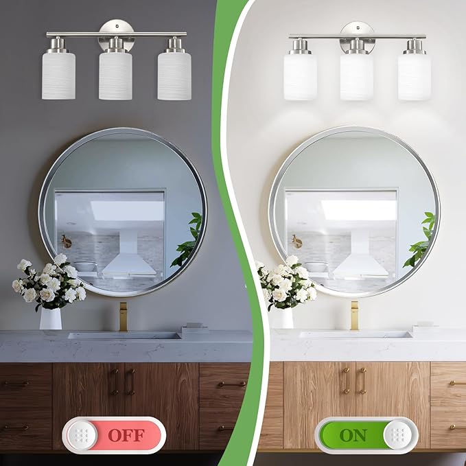 - MILKY WHITE FROSTED GLASS SHADE: This 3-light brushed nickel bathroom light is crafted with a sleek finish and a textured milky white glass shade. Bathroom lamp can softly diffuse light and reduce glare and eye fatigue. Bathroom light fixtures over mirror is perfect for makeup and grooming