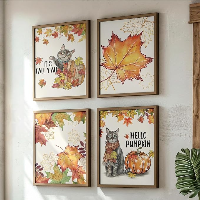 JXREQ Fall Decor Cat Decor Pumpkin Wall Art Prints, Cute Cat Maple Leaves Happy Fall Yall Posters, Rustic Fall Art Prints for Harvest Thanksgiving Kitchen Bedroom Living Room, 8x10 Inch 4Pcs Unframed