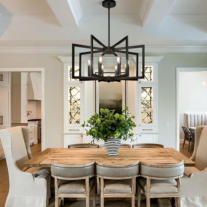 8-Light Large Black Chandelier,Dining Room Light Fixture Geometric Metal Modern Chandelier,Hanging Industrial Metal Chandelier for Kitchen Island Entryway Stairway Foyer Hallway.