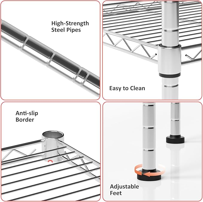 - 【Adjustable and Detachable】 The height of the rack shelf can be adjusted arbitrarily to achieve flexible storage. wire shelf can be assembled or disassembled into two or three layers. You can split it according to your actual needs, or you can put several shelves together to create more storage space, it is the perfect shelf for the kitchen, warehouse, living room, pantry, office, and more.