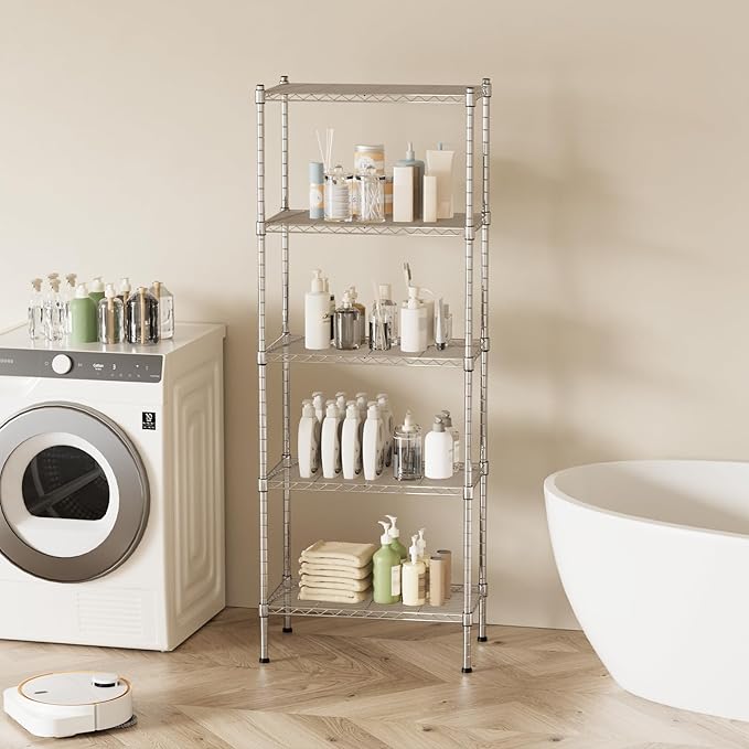 5 Tier Shelving Unit, 176 LBS Per Shelf Height Adjustable Narrow Storage Shelves, Heavy Duty Metal Garage Metal Shelves for Kitchen, Restaurant, Pantry, Laundry, 23"x 13.4"x 59", Chrome
