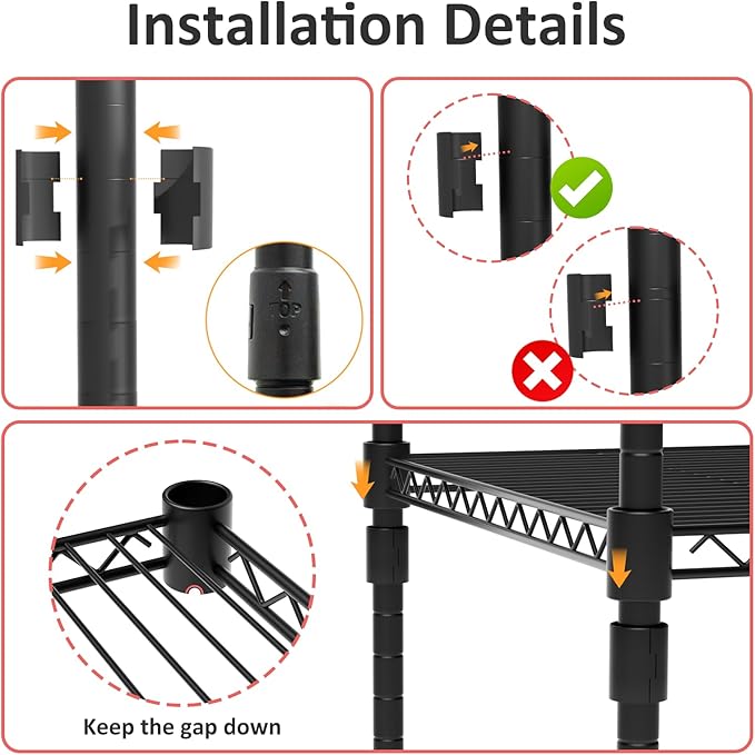 - 【Easy Assembly】The wire shelves with wheels is easy to assemble, does not require any tools, and the height of each layer can be adjusted according to needs, just clamp the metal grid plate on the column, and then slide the metal grid plate along the column until the metal shelf is firmly fixed on the buckle. The shelving with wheels also comes with a user manual to guide you through the quick and easy assembly process.