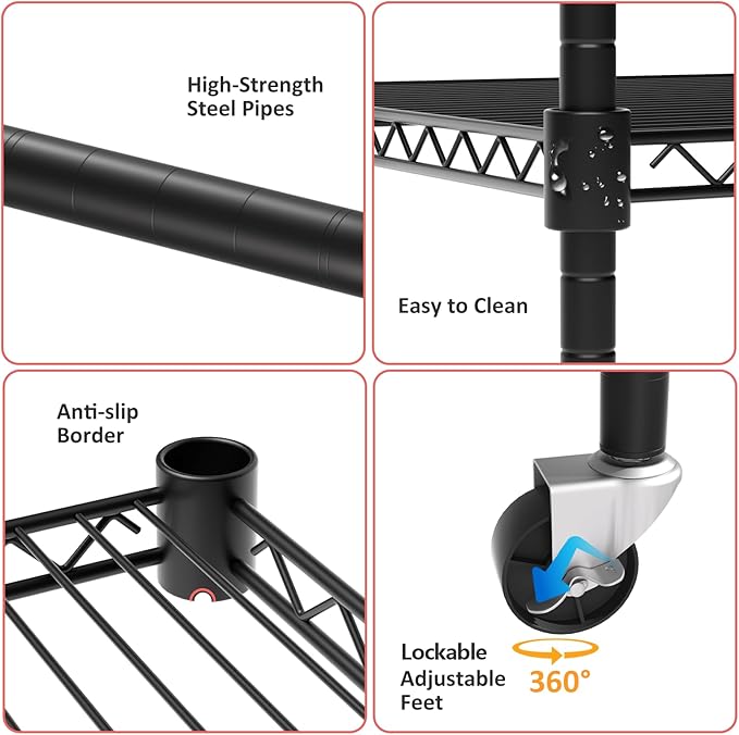- 【Adjustable Feet and Convenient Wheels】The wire shelving with wheels comes with 4 sturdy 360 degree rollers, two of which can be locked, so you can push the storage shelves with wheels to where you need it, anytime, anywhere, and keep it in place. The adjustable leveling feet can keep the metal shelves in a fixed position, so that the device can maintain balance and stability, and solve the problem of uneven ground.