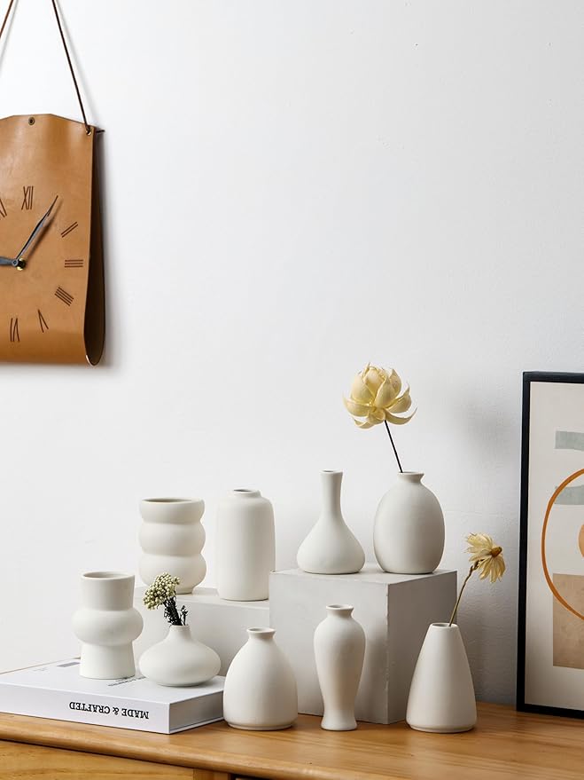 - 「Minimalist DESIGN」What you get: 9 small ceramic vases, each with various shapes, sizes and patterns. These charming bud vases feature matte unglazed surface with organic, rustic look. Great for farmhouse and boho or modern weddings, living room and home decor.