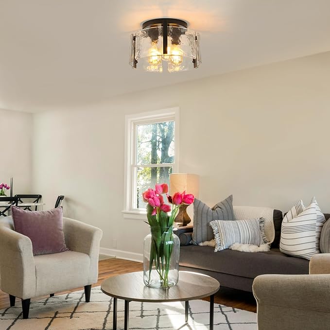 - Black Ceiling Light Fixtures Flush Mount - This 3-Light black semi flush mount ceiling light fixture with seeded glass shade features a fixture with a frame made of sturdy, durable metal that resists rust, dust and corrosion. The delicate clear hammered glass shade diffuses the light farther and brighter, protecting your eyes from glare while providing an elegant and wonderful projection through the seeded glass to enhance the overall aesthetics of the room!