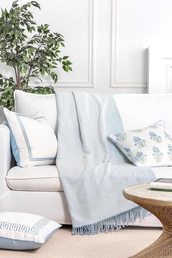 Hofdeco Premium Coastal Decorative Throw Blanket for Patio Couch Sofa, Baby Blue Herringbone with Fringe, 52"x72"