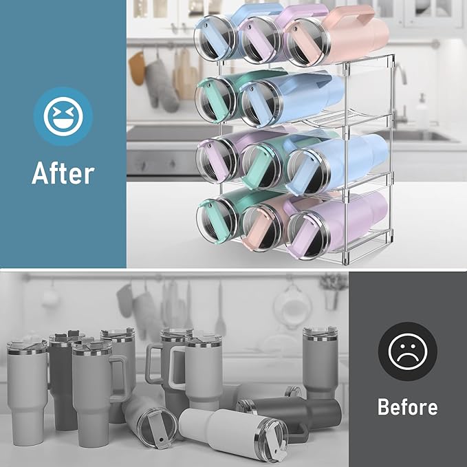 - Expanded Compartment Width & Length: Specifically tailored for the Stanley 40 oz water bottle. Unlike market products that are limited to holding just 2 Stanley 40 oz tumblers with handles per row, our innovative design allows for a full 3 bottles per row by improving both the width and length of our cup storage, totaling 12 bottles, for unparalleled organization and storage efficiency.