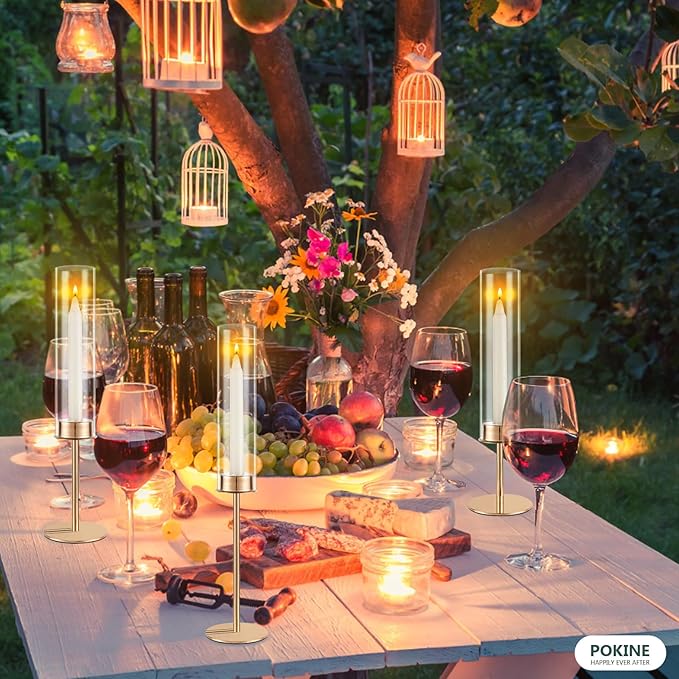 - Understated and Classic Glass Candlestick Holder: Chic gold candle holder matches well with removable thick hurricane cylinder.Different height candlesticks, The visual effect of the high and low undulating candlelight gives you a wonderful feeling.Add a more romantic atmosphere to your dates, parties, holiday celebrations and anniversaries.