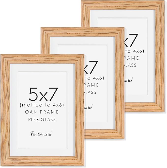 5x7 Picture Frame, Solid Oak Wood 5 x 7 Frame with Plexiglass, 5 by 7 Photo Frame for Wall & Tabletop Display, 5x7 Picture Frame Matted to 4x6, Natural Oak Color, 3 Pack