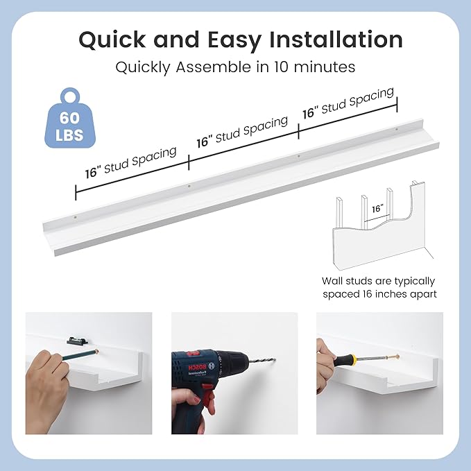 - Easy to Install: You will get a level, screws for the wall, drywall anchors, a detailed installation guide, and two beautiful hand-crafted solid pine wood shelves. With the level, you can make sure your picture ledge shelves are well aligned. Just follow the simple instruction to install the hanging shelves for wall decor within 10 minutes. We add additional screw and anchor to the hardware bag just in case. If you have any questions about our products, please feel free to contact us