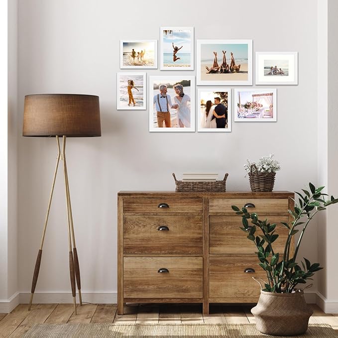 - Multiple Frames : Set of 3 pieces in the same sizes White 8x10 frames This is the most economical frame on the market; You'll want to buy more than one to display family portraits or gift to loved ones for neat and uniform wall decoration. Lightweight but well made, comes with Strong tempered glass, better protection from scratches.