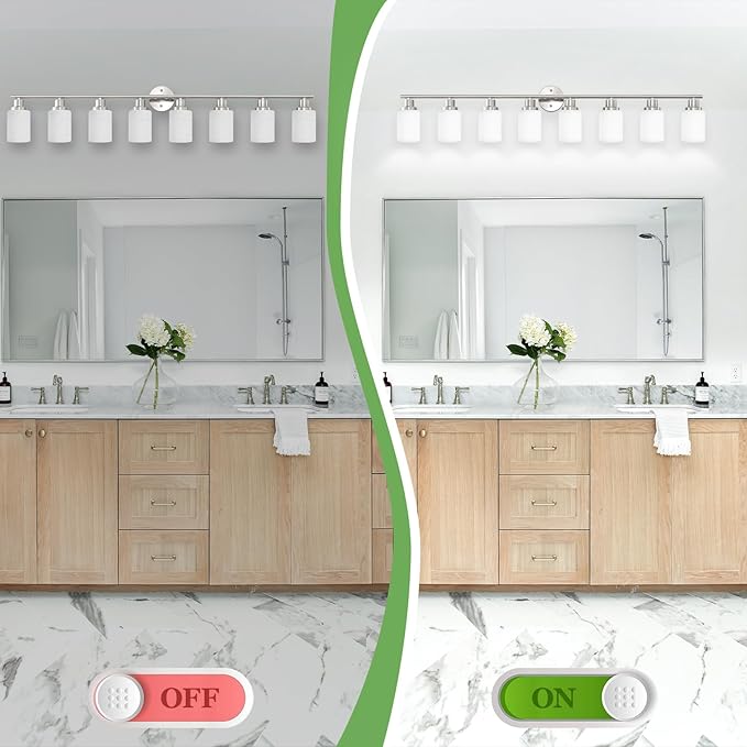 - MILKY WHITE FROSTED GLASS SHADE: This 8 light brushed nickel bathroom light is crafted with a sleek finish and a textured milky white glass shade. Bathroom lamp can softly diffuse light and reduce glare and eye fatigue. Bathroom light fixtures over mirror is perfect for makeup and grooming