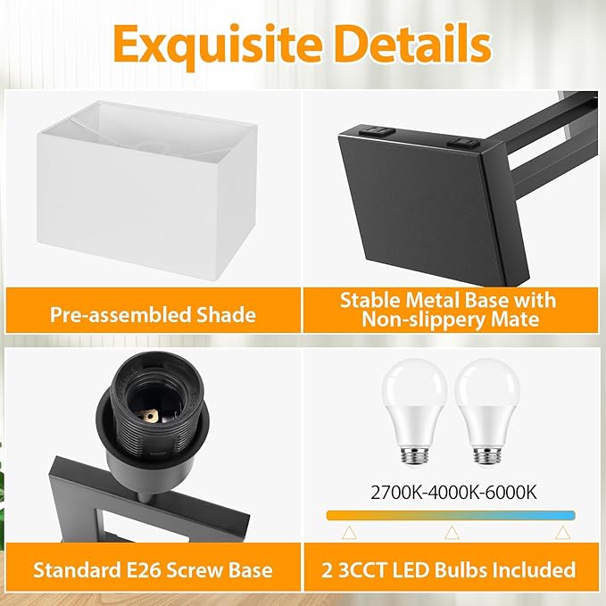 - γπ΄ππππ-ππππππππππ & π½ππππππππ π―πππ π³ππππγThe matte black metal structure matches well with the white rectangle shade, our set of 2 table lamps emit endless stylish feeling that are capable to fit in various home styles like modern/contemporary/farmhouse. Not only table lamps that offer practical lighting but also amazing decorations for any space. With the weighted base and attached anti-fall mat, our touch lamps will be stable on your nightstands, end tables, side tables, desks, TV consoles