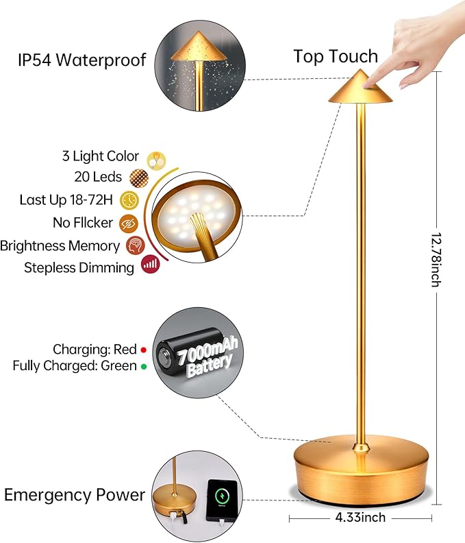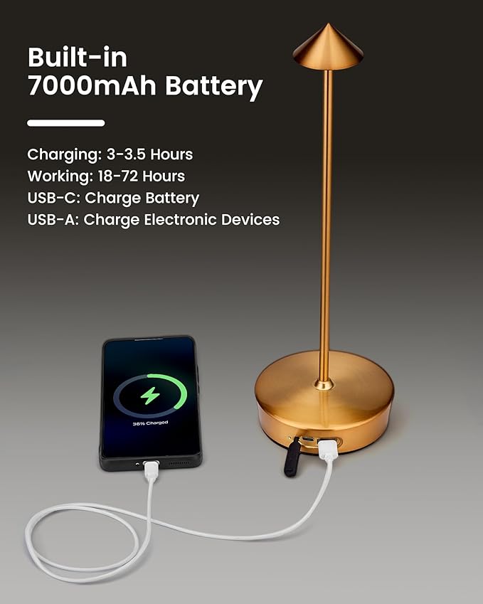 - 【Cordless Table Lamp Rechargeable】As adopt a safe and durable 7000mAh rechargeable lithium-ion battery, it can be used up to 18-72 hours as long as fully charged with 3-3.5 hours in advance. You can easily charge the battery by using the attached USB-C cable, The red light is flashing when it is charging; the green light is always on when it is fully charged.