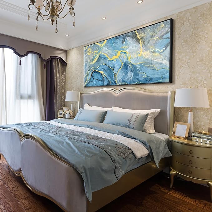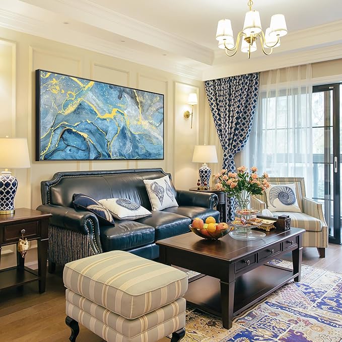 - Large Framed Wall Art:The abstract wall art brings an artful and modern look to your walls.It features a series of swirling patterns against a blue background with a black and yellow color palette for a glam style.This canvas wall art incorporates abstract movements of ocean and beach,which will add a touch of sophistication to your space