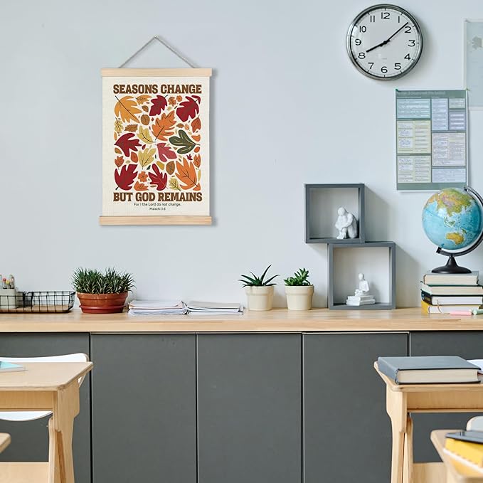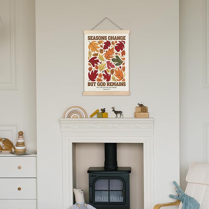 Supwhd Christian Fall Wall Art with Wooden Poster Hanger, Fall Wall Decor, Fall Posters, Farmhouse Autumn Harvest Thanksgiving Wall Art Decor, Fall Home Decor, Seasons Change God Remains 16x24