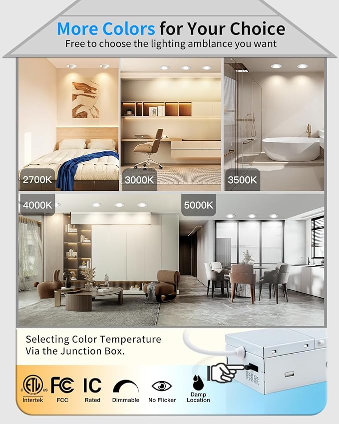 - ✅【5 Color Temperature Reset】The slim gimbal canless led recessed light 3 inch 5 in 1 will help you get rid of the trouble about color temperature and room matching. There are 5 temperature: 2700K(soft white), 3000K(warm white), 3500K(neutral white), 4000K(cool white) and 5000K(daylight). Simply try out the various color temperatures by the slider switch on the junction box to select the most suitable one for its locations.