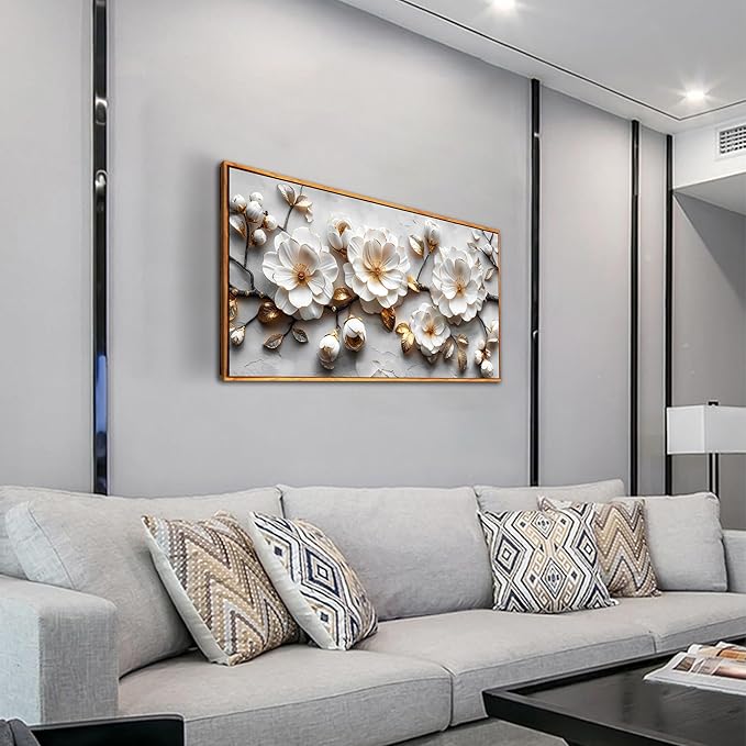 Ouzzlie Floral Wall Decorations White Pictures Modern Framed Poster Wall Art Gold Wall Decor Big Artwork 29"x 59"