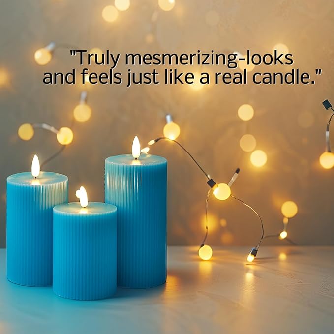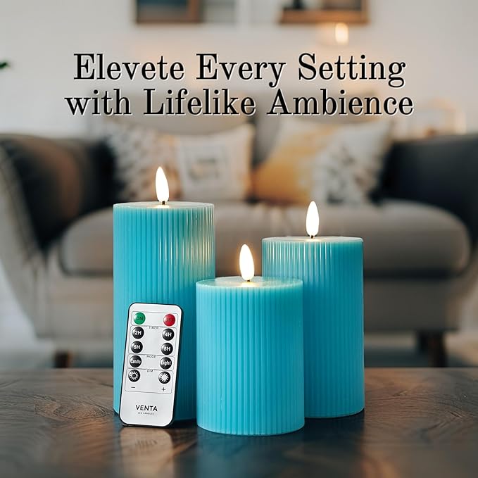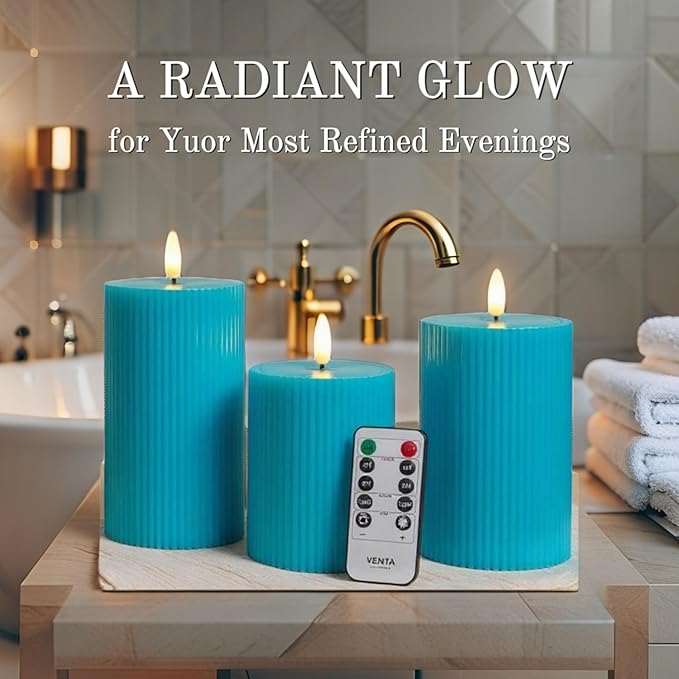 - ๐ A PERFECT GIFT FOR DECOR LOVERS: This beautifully packaged set of 3 ribbed turquoise candles makes a thoughtful and unique gift for housewarmings, birthdays, or for anyone who loves to style their home with vibrant colors. (Batteries not included: each candle requires 2 AA).