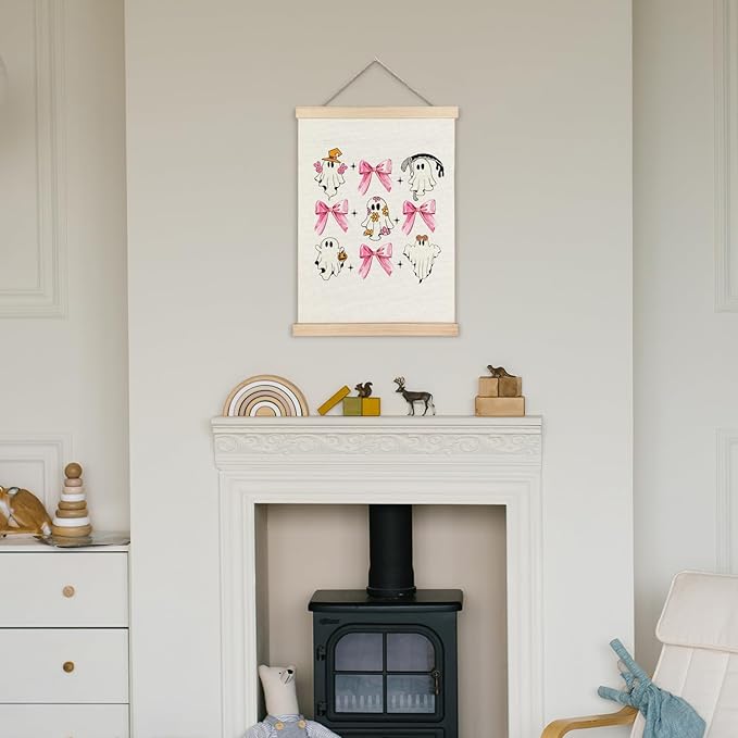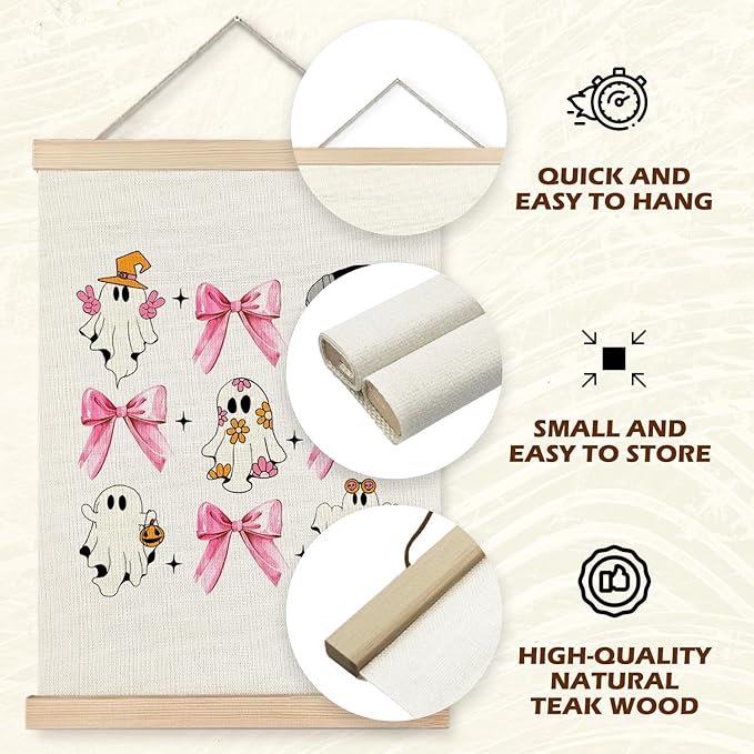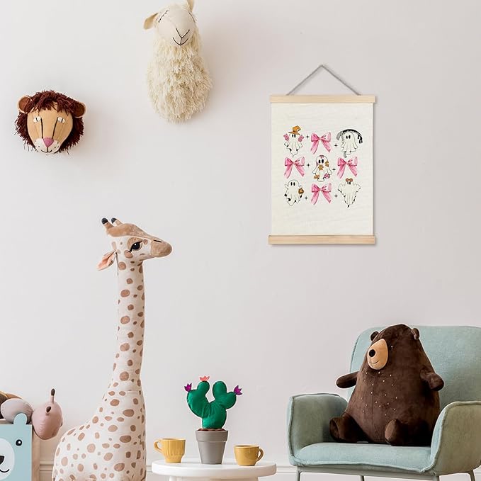 Supwhd Cute Halloween Ghosts Wall Art with Wooden Poster Hanger, Trendy Preppy Pink Bow Coquette Wall Decor, Coquette Preppy Room Decor, Halloween Pictures Wall Decor, 16x24