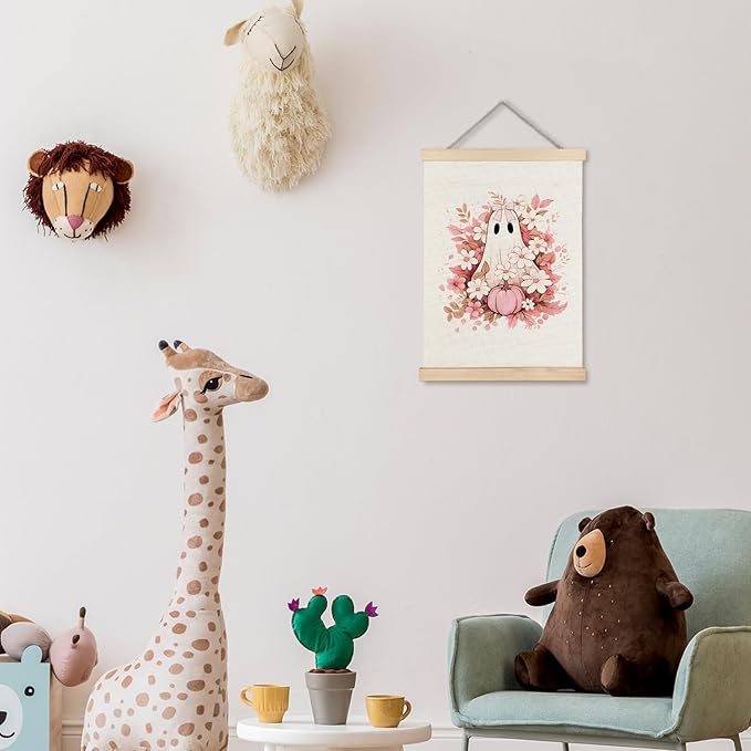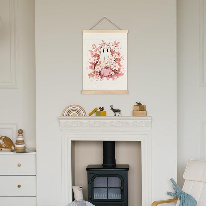 Supwhd Fall Floral Halloween Ghost Wall Art with Wooden Poster Hanger, Pink Bow Ghost Coquette Wall Decor, Coquette Preppy Room Decor, Halloween Pictures Wall Decor, 16x24