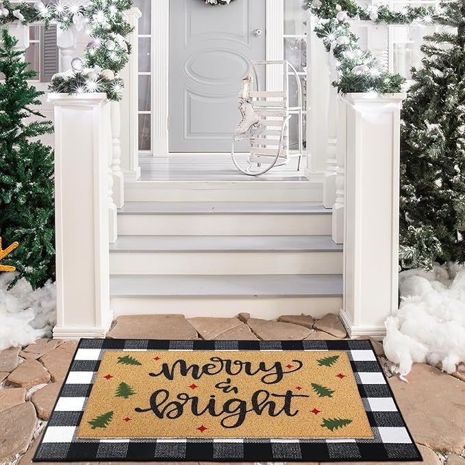 2 Pcs Christmas Welcome Door Mat Merry Bright Outdoor Welcome Mats for Front Door Non Slip Xmas Tree Coir Floor Mat Black White Check Christmas Rug for Outside Front Porch Entryway Decor