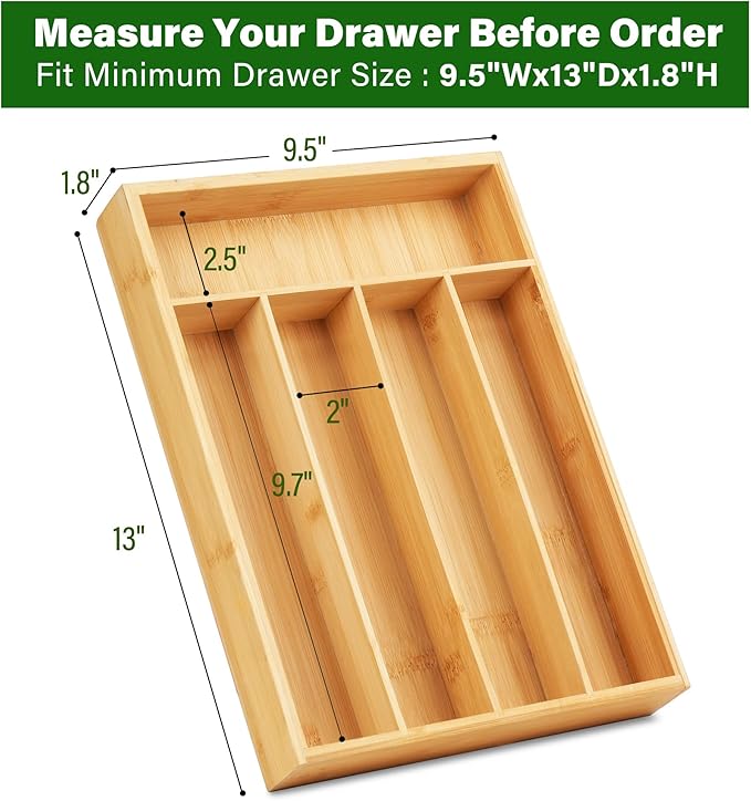 - Solid Bamboo: Our silverware tray is made of 100% bamboo, no MDF, odor-resistant, does not crack or warp easily; smooth surface, corners & edges