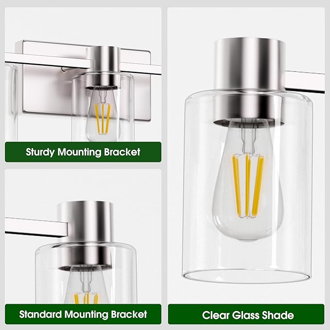 - Durable Material: This vanity light is coated with anti-rust coating, no worries about getting oxidation or color fading, even if using them in bathroom or other moist places. Transparent glass shades maximize light output for an maximal bright ambience.
