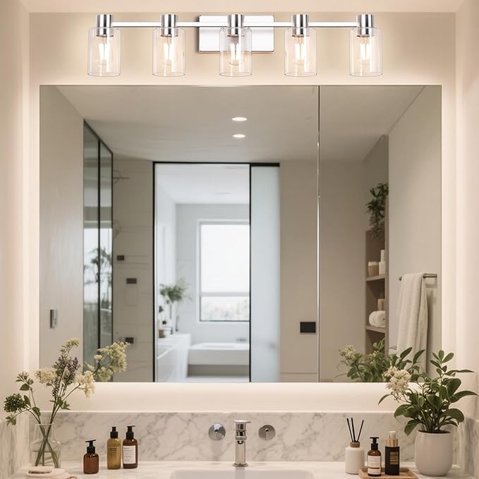 5-Light Modern Vanity Light Fixtures Over Mirror, Brushed Nickel Bathroom Light Fixtures, Vanity Lights, Wall Sconce with Clear Glass Shade for Bathroom, E26 Base