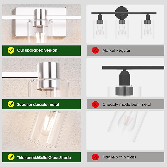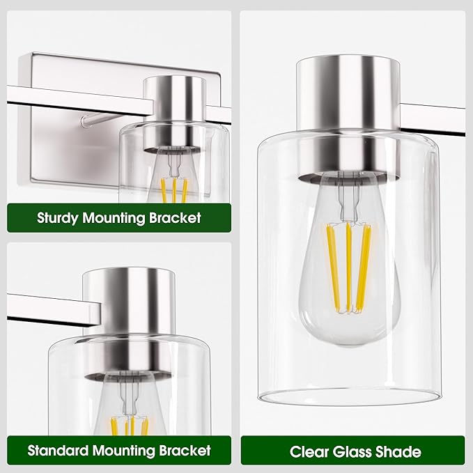 - Industrial Aesthetic Design: Brushed nickel metal and transparent glass shade designs creat a simple and pure sense of beauty. This vanity light is a great decoration way to update your room decoration style.