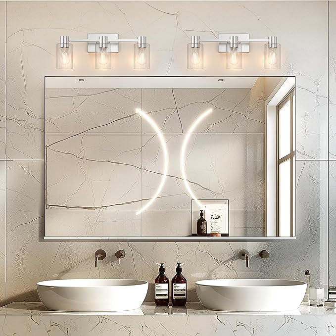 - Durable Material: This vanity light is coated with anti-rust coating, no worries about getting oxidation or color fading, even if using them in bathroom or other moist places. Transparent glass shades maximize light output for an maximal bright ambience.