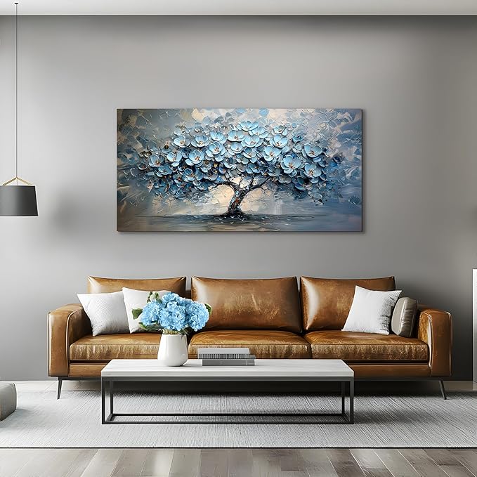 crmotu Tree of Life Large Wall Art for Living Room, Blue Floral Tree Abstract Canvas Prints Aesthetic Pictures, Modern Neutral Wall Decor for Bedroom Bathroom Office, Nature Botanical Decor 24"X48"