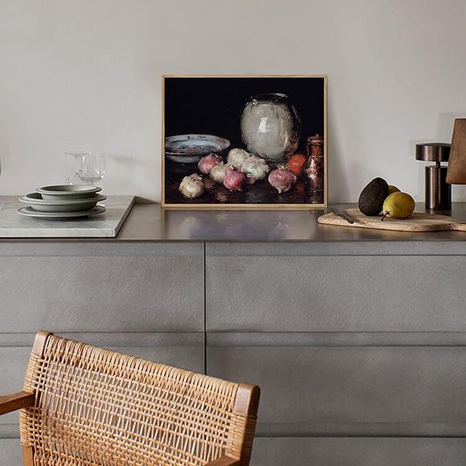 crmotu Vintage Framed Wall Art, Still Life Onions Canvas Oil Paintings, Black Antique Kitchen Decorations Art Prints, Rustic Home Decor Bedroom Dining Room Desktop Farmhouse Aesthetic Artwork 8x10in