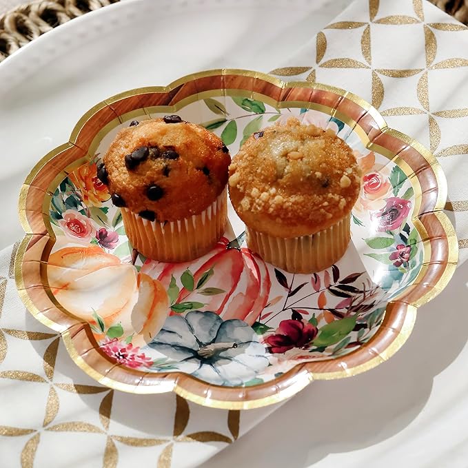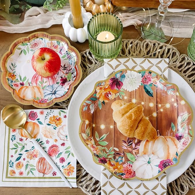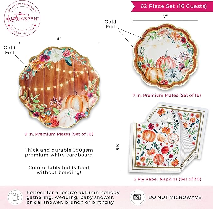 - Beautiful & Functional -Fall/Thanksgiving Tableware Set (16 guests) pairs with many of the other complimenting items from Kate Aspen's Fall collection for a festive autumn holiday gathering. The plates feature brightly colored fall watercolor flowers, greenery, pumpkins, and string lights with a scalloped edge gold foil border. The Fall/Thanksgiving paper napkins feature a vibrant fall print with a gold border along the outside.