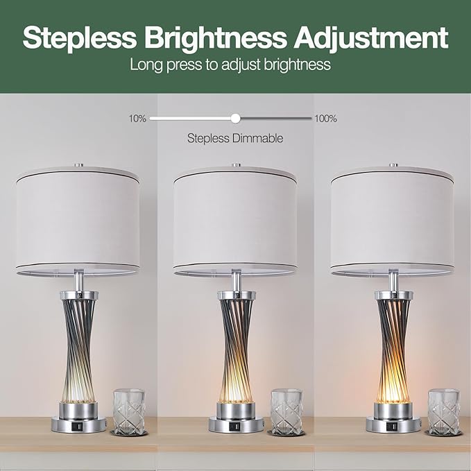 3-Way Dimmable Table Lamp Set of 2,Touch Control Lamp with Night Light,Modern Blue Crystal Table Lamps for Bedroom,Living Room,Bedside Lamps with USB A+C Ports,Fabric Lampshade(Blubs Included)