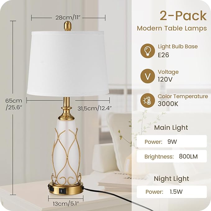 - Contemporary & Elegant Design: Our bedroom nightstand table lamp, with its white frosted glass pole and fabric lampshade, creates a vintage look perfect for home and office decor. This lamp brings a warm and romantic atmosphere to living rooms, bedrooms and other spaces