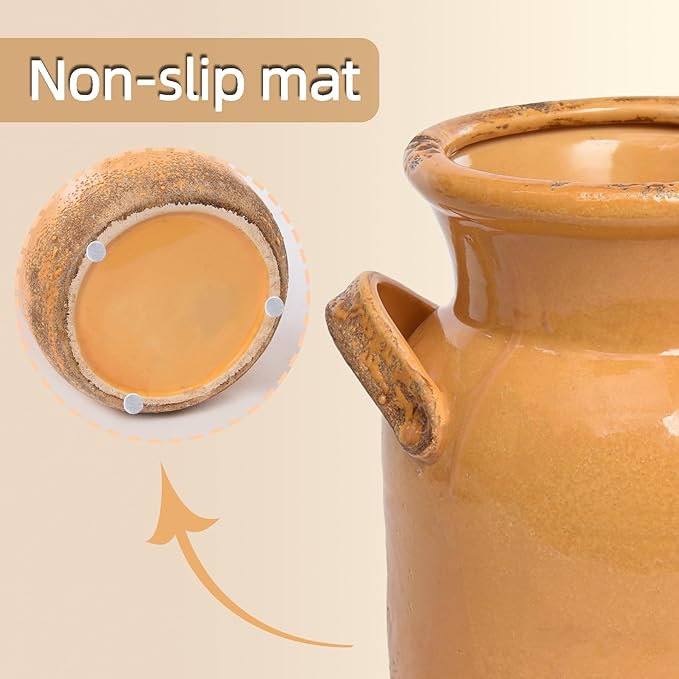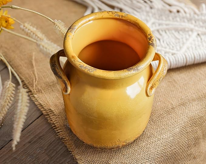 Quoowiit Ceramic Rustic Farmhouse Vase, Distressed Decorative Flower Vases for Home Decor, Ideal Shelf Decor, Yellow Boho Vase for Living Room Bedroom Kitchen Office Centerpiece Table Decorations