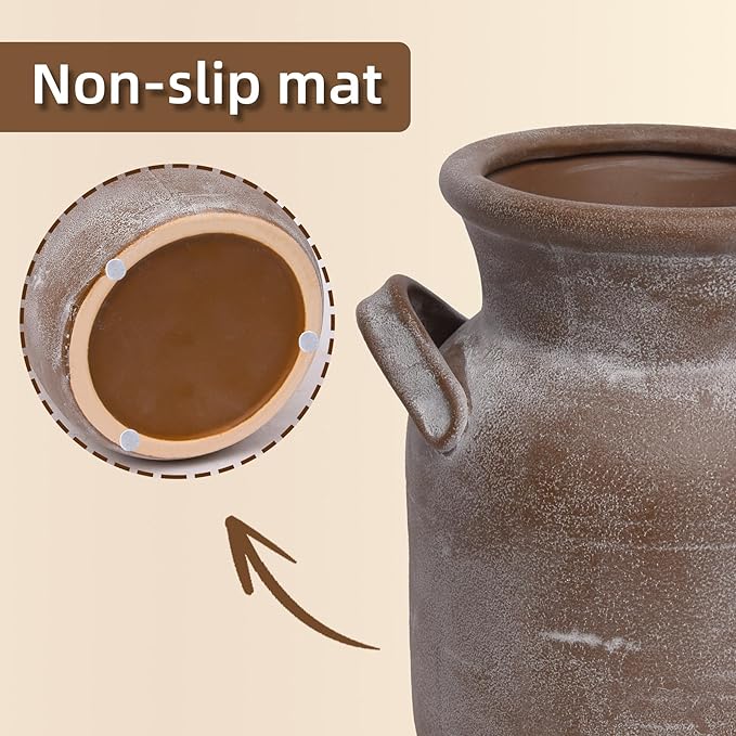 - 【Distressed Finish】 The rustic vase is designed with retro and distressed surface. The shape of flower vase is round and lovely. Two handles on sides are easy to move and decorate whole ceramic vase, enhancing your interior style design and show your elegant artistic taste.