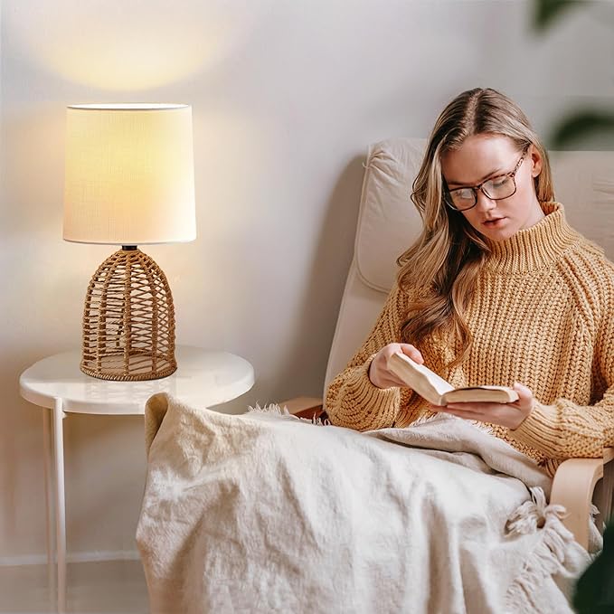- High Quality and Easy to Use: With a solid base and choice fabric shade, these modern farmhouse table lamps are not only sturdy but also softens the brightness to protect your eyes. The rattan lamp 1.5-meter black US standard cord provides flexibility in lamp placement. Rustic table lamp assembly is quick and easy, taking just a minute.