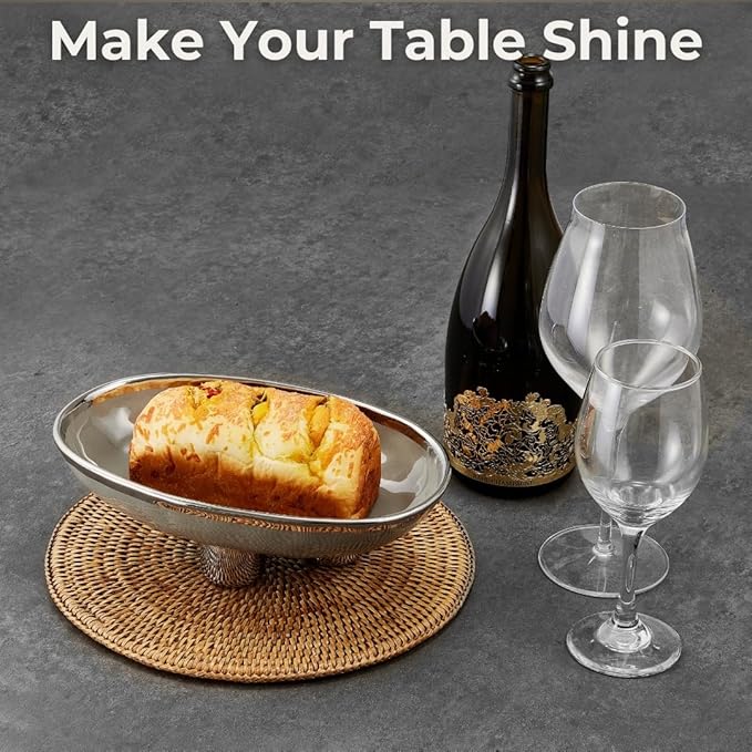 - Cool grey ceramic with a polished silver rim and silver pedestal—clean and modern. Beautiful as a centerpiece bowl, a sleek candy bowl, or a gleaming candy dish on the kitchen counter; the neutral tone reads graphite/charcoal/smoky depending on the light.