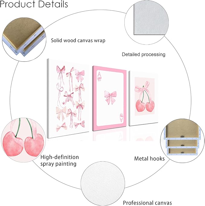 - Trendy Pink Bows Design: This charming set of 3 pink canvas prints combines elegance and playfulness, featuring delicate watercolor bows, a stylish cherry motif with ribbon accents, and a vintage-inspired Ace of Hearts card design. Perfect for creating a soft, preppy, and coquette aesthetic, these trendy wall art pieces add a feminine touch to any space. Whether for a girl’s bedroom, a living room, or a college apartment, these prints bring a fresh, lighthearted vibe to your home decor. The harmonious mix of pastel pinks and clean lines ensures they complement both modern and vintage styles effortlessly.