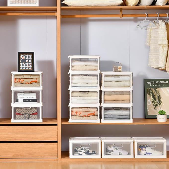 Stackable Plastic Storage Bins with Lids, Foldable Closet Organizers and Storage, 3 Drawer Storage Organizer,Clear Stackable Containers for Wardrobe,Bedroom,Office,Dorm
