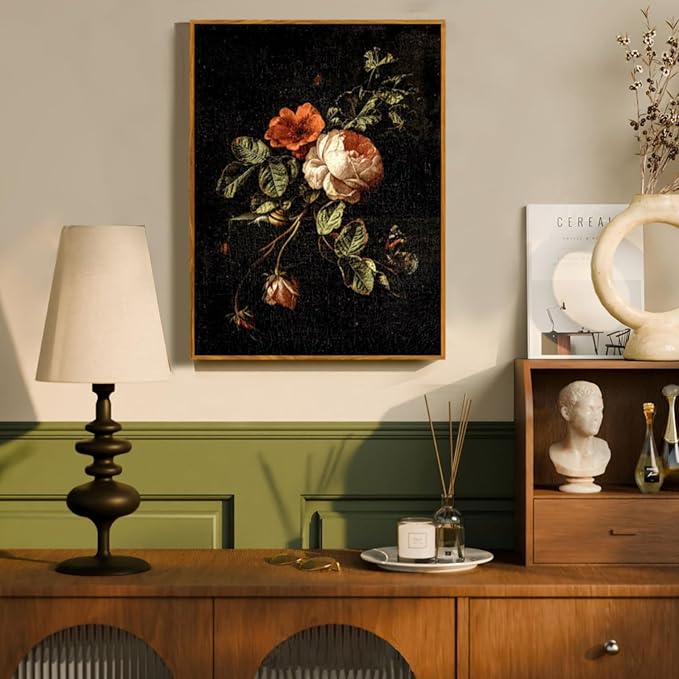 - Retro Dark Rose: A blooming rose stands out vibrantly, with a snail slowly crawling on it and a butterfly perched on its leaves. The lively scene contrasts with the black background, adding a touch of dark academia style to the wall decor