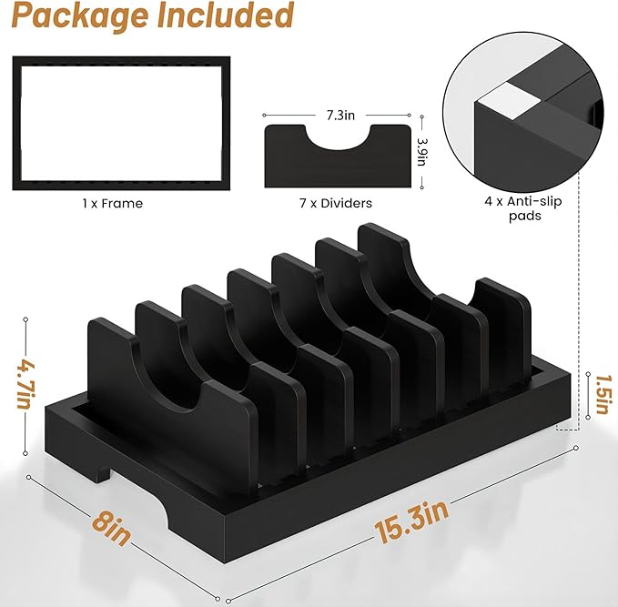 - ๐๐จ๐ฆ๐ฆ๐ข๐ญ๐ญ๐๐ ๐ญ๐จ ๐๐ฅ๐ข๐ฆ๐ข๐ง๐๐ญ๐ ๐๐ฅ๐ฎ๐ญ๐ญ๐๐ซ -This pot and pan organiser has 7 dividers and 13 slots for quick and easy installation. There are anti-slip pads on the bottom to prevent sliding on the counter. Place removable dividers into slots to fit different sizes of pots and pans depths. The unique semicircular groove design next to the handle makes it easy to carry.