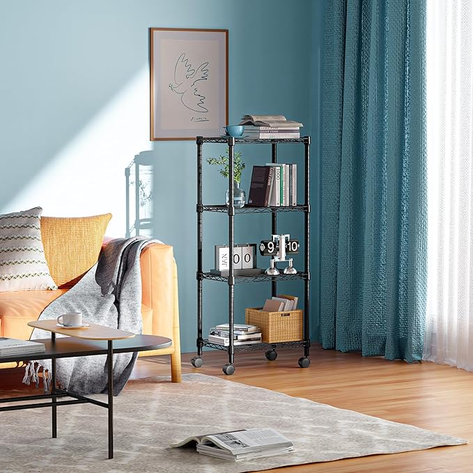4-Shelf Adjustable Heavy Duty Steel Wire Rack, Adjustable Storage Shelving Unit with Wheel for Kitchen, Garage, Laundry Black 11.8" D x 17.7" W x 40.8" H